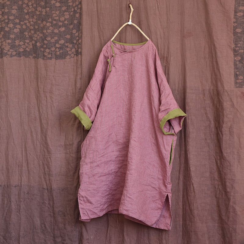 Sommer Retro Løs Stribet Patchwork Midi-kjole I Hør